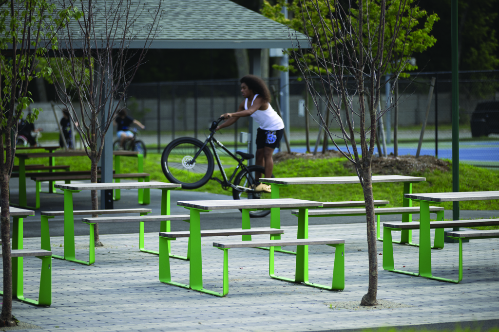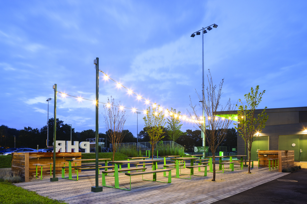 Designed by Warner Larson Landscape Architects, the park integrates thoughtful design elements to enhance the visitor experience. Notably, a 12-foot-high central lawn mound, constructed from on-site soils, provides 360-degree views of the fields, creating an ideal spectator vantage point. Additional features include state-of-the-art sports lighting, spectator seating, and an outdoor game plaza that promotes community gathering and interaction. Site furnishings from mmcité include Rautster tables, Vera and Vera Solo benches, Bistrot tables, Lot bollards, and Prax litter bins.