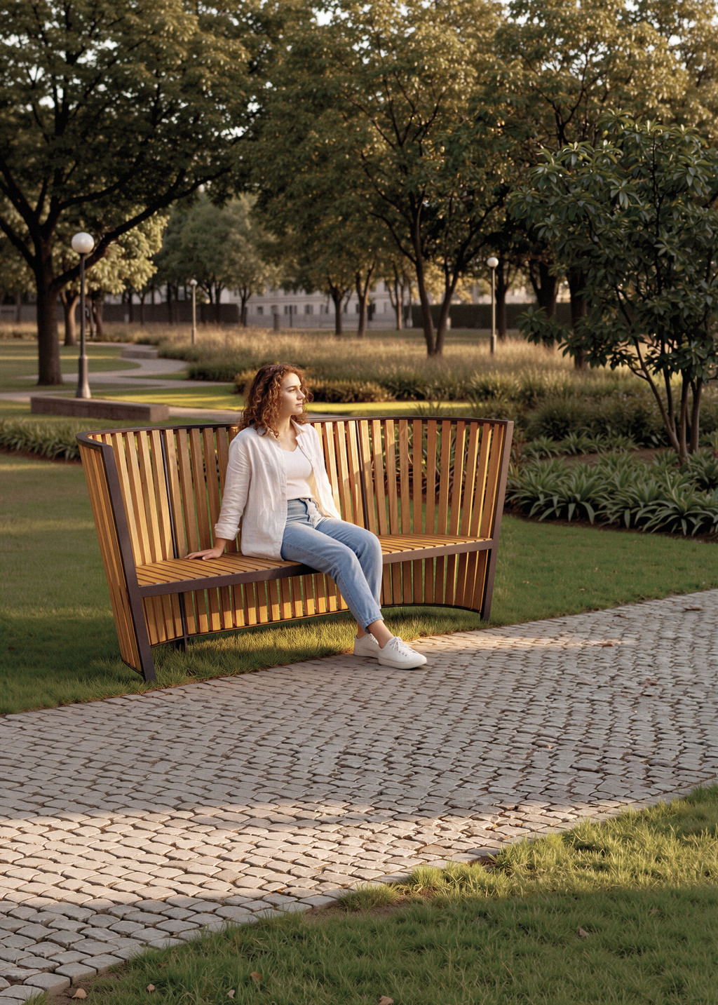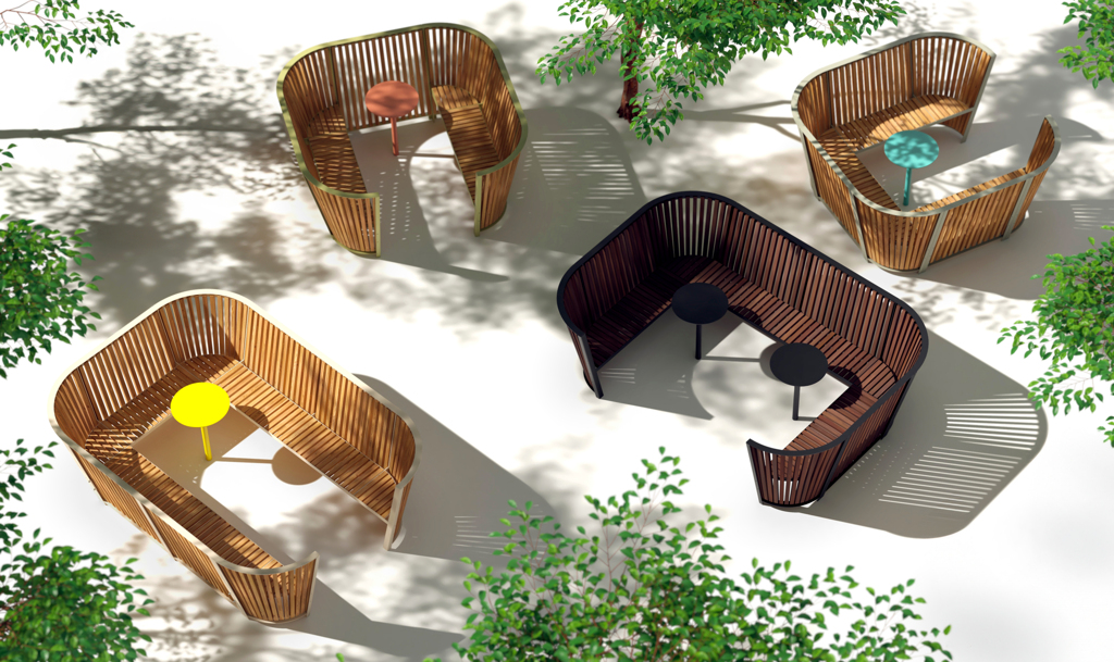 Galvanized steel structure treated with powder coating. Seats and backrests are made of wooden slats, with the option to add armrests. Anchored below the ground.