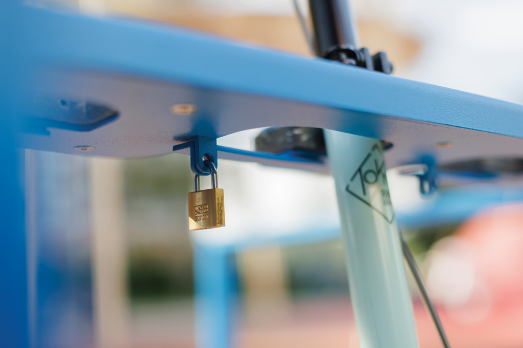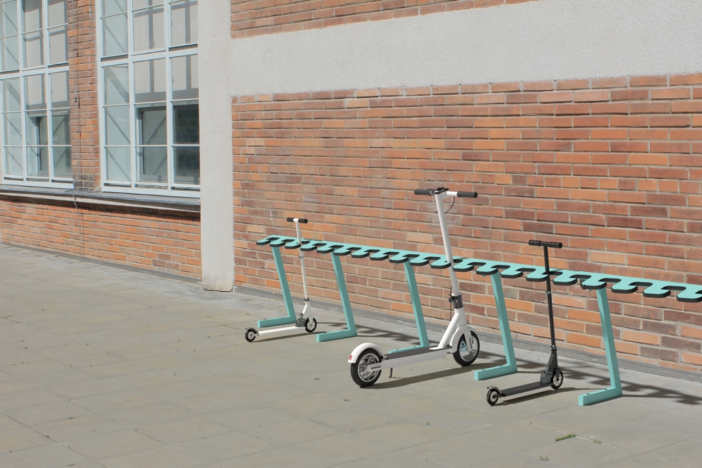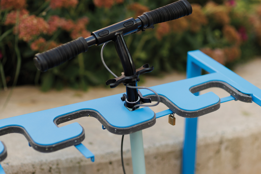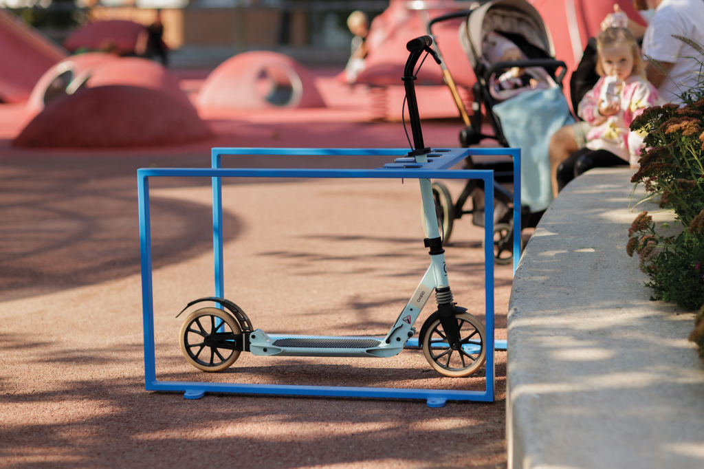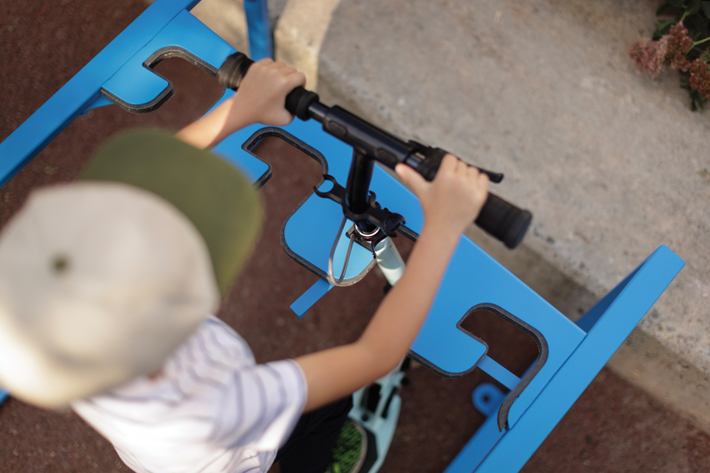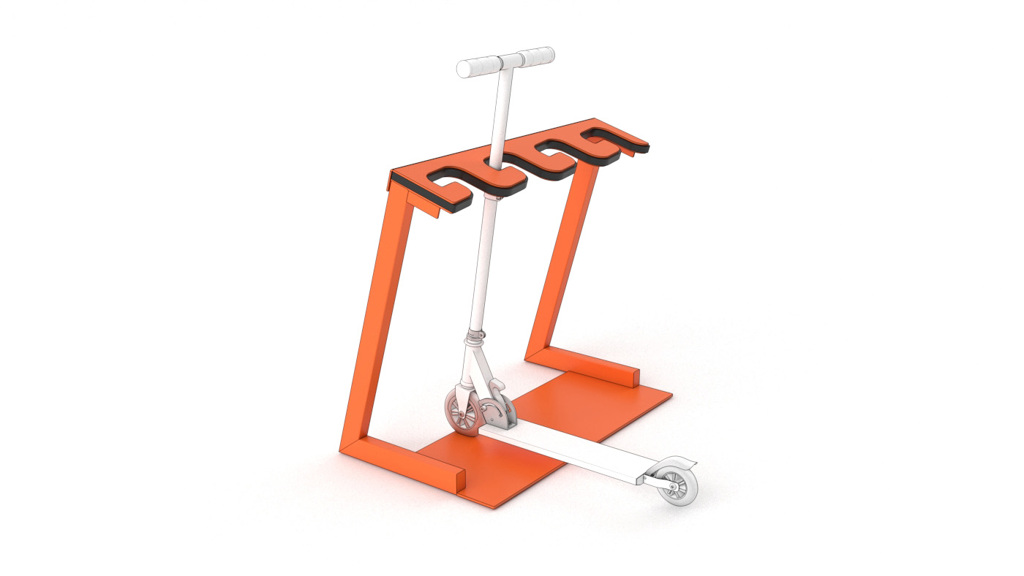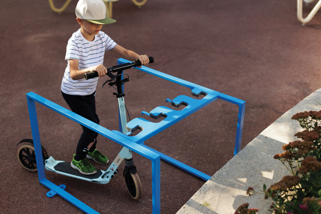 La trotinette est la joie d'aujourd'hui et le trot esst un port entre sur vos routes. Le plastique recyclé peut être inséré entre nos supports à vélos, fixé au mur ou utilisé comme élément séparé. La collection répond au besoin d'aménager les lieux avec des trotinettes dispersées en suivqnt selon les besoins du guidon.