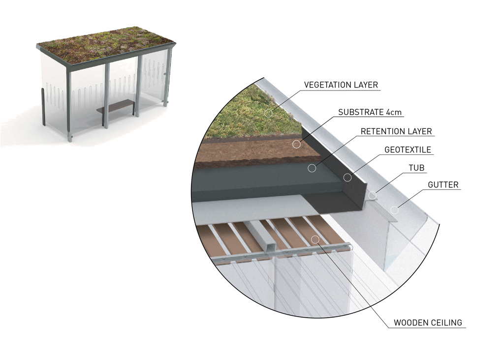 The Cuby Rest outdoor gazebo consists of a powder-coated steel structure, walls and roof made of steel cables for climbing plants growing from a flowerpot, which is part of the structure. Anchoring can surface mount or hidden below.