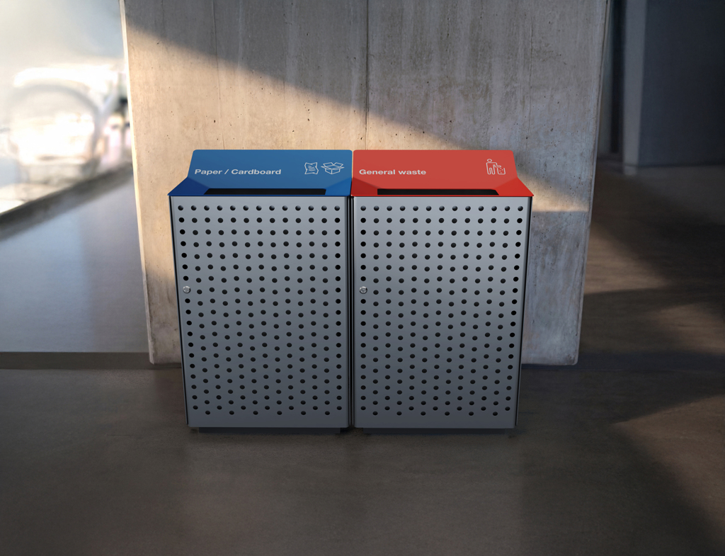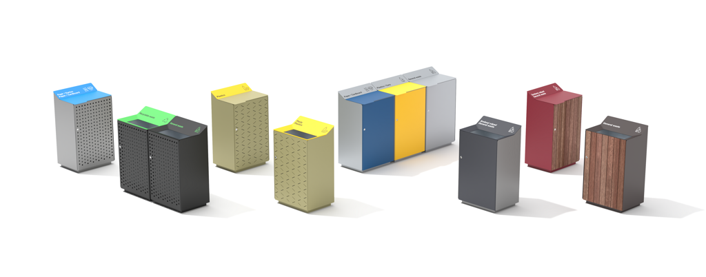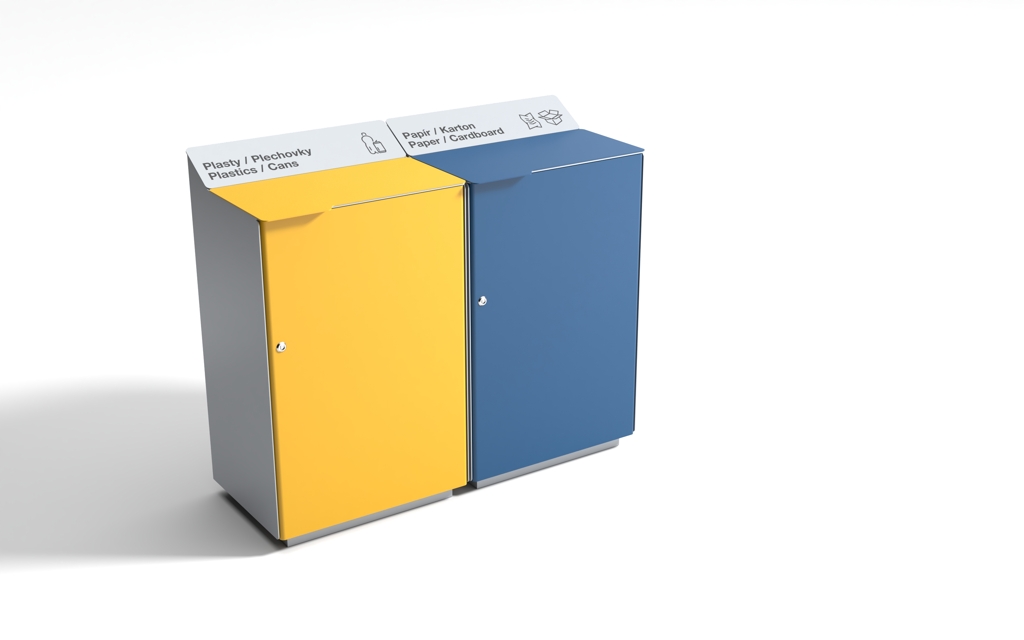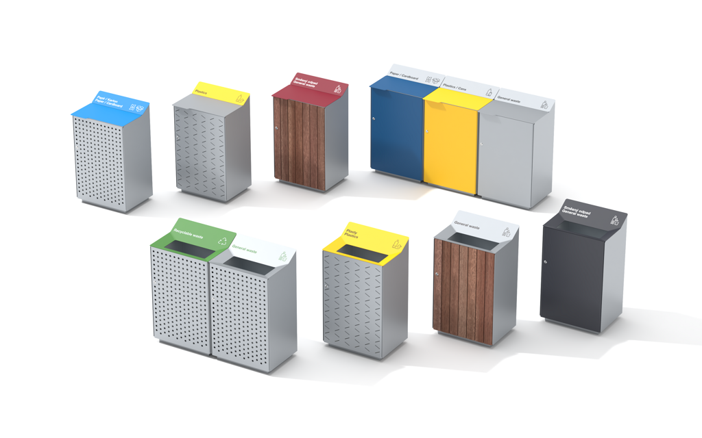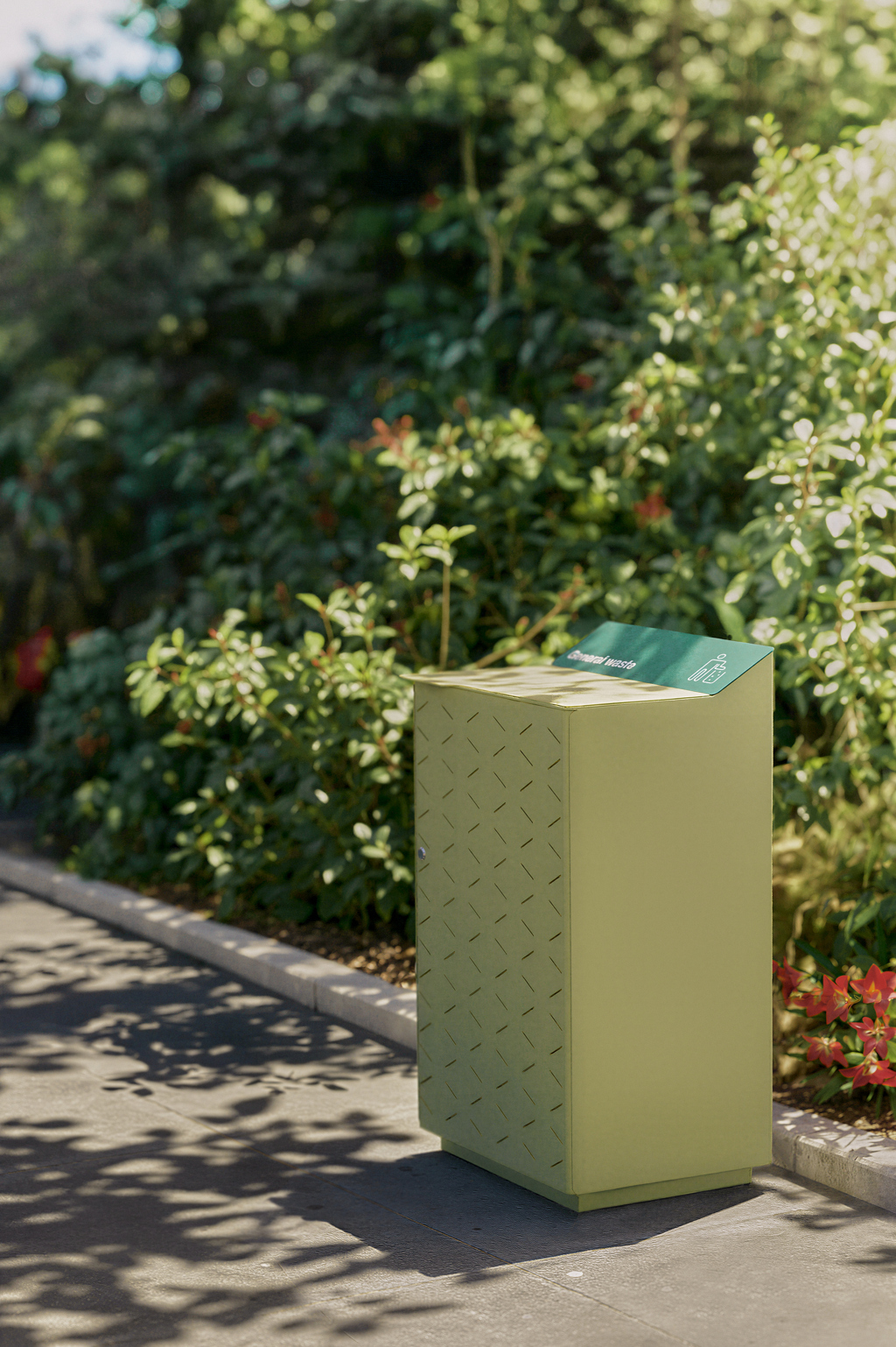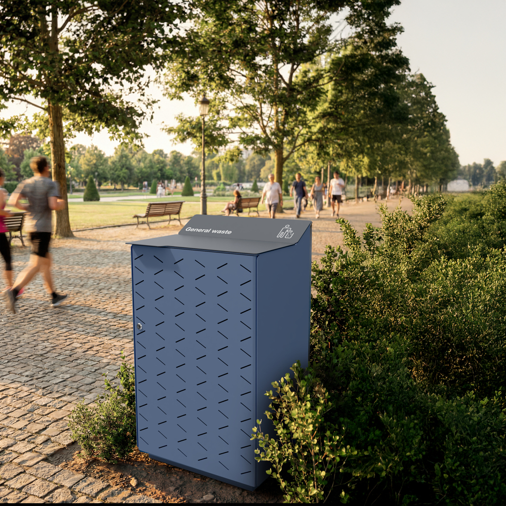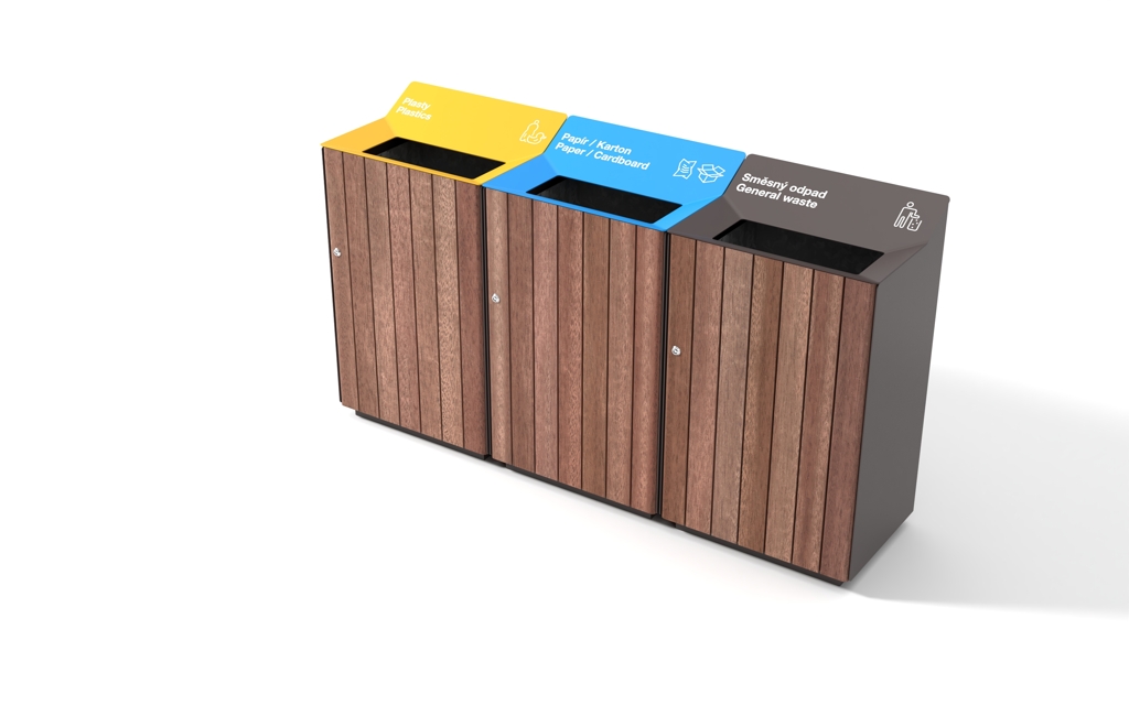 The 160-litre Skyline bin offers high-capacity waste collection in a sleek functional design. The body is divided into two sections. The taller, rear portion features a sloped canopy, ideal for pictograms and multilingual labelling. The front, lower section includes either an opening for fast waste disposal or a hinged lid that securely closes the contents inside. The bin is available in two material options: wood or metal sheet. The metal version can be plain (with an optional logo), perforated, or enhanced with decorative line patterns. This segmented design allows for various colour options – whether to match city or campus branding, or to support colour-coded waste sorting. When installed in groups, the bins provide an ideal solution for sustainable waste management in urban environments.