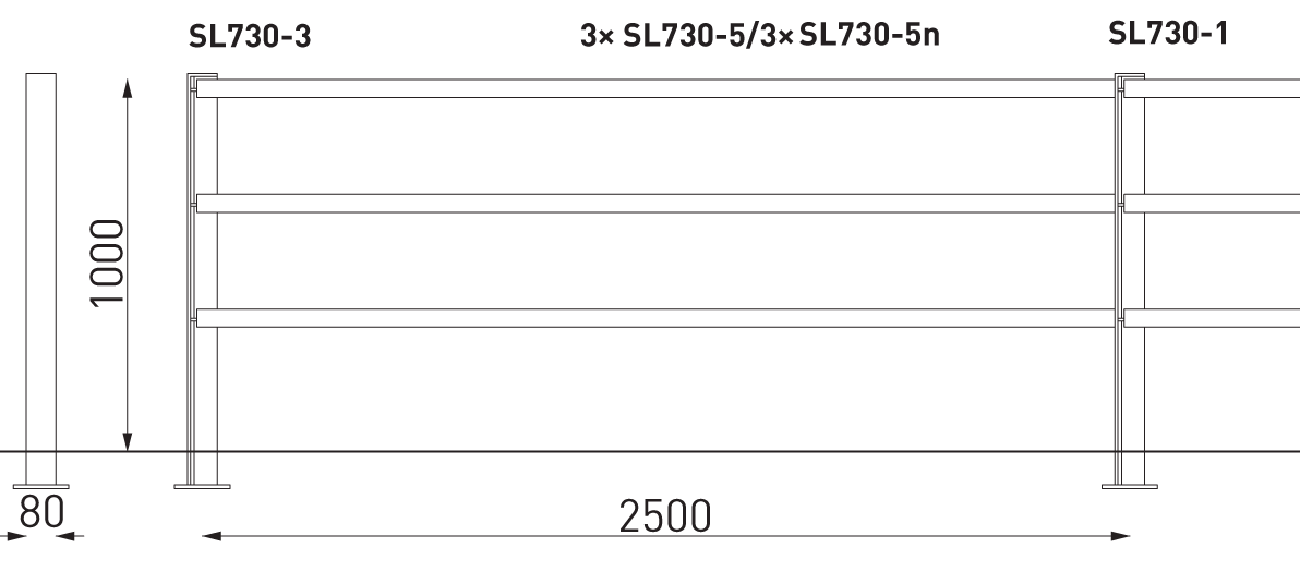 Dos alturas de perfiles de acero "L": 60 mm o 80 mm. Estructura de acero galvanizado con revestimiento de pintura en polvo. Para la versión de más elementos horizontales (SL700) recomendamos una combinación de dos tonos de color. Anclaje bajo pavimiento.