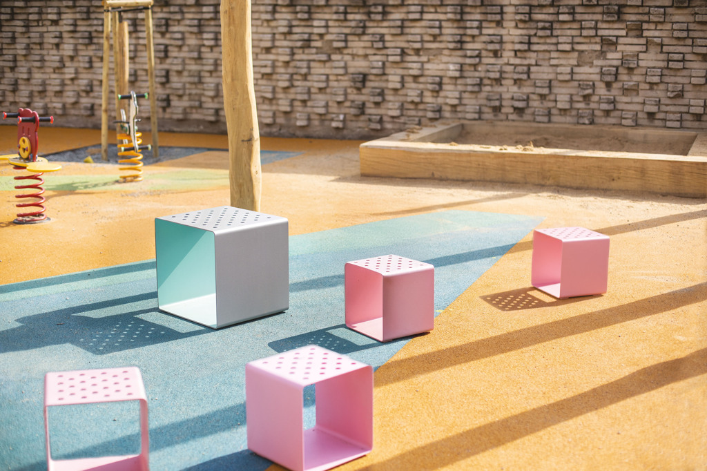 La estética del acero plegado se realza con perforaciones puntuales que capturan a la perfección el carácter del diseño del banco infantil Radium. El acabado bicolor de las patas de acero aporta un toque de diversión y complementa cualquier espacio, tanto en interiores como en exteriores. Combinado con el exclusivo asiento Citépin, equipado con tapas de plástico, elimina la sensación fría del metal.