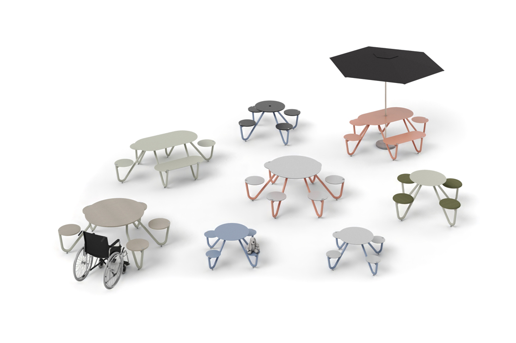 I sedili rotondi orbitano intorno al tavolo circolare come pianeti, ma possono unirsi anche in un ovale. Tutti possono godersi il pasto seduti a tavola all´aria aperta, abbastanza vicini, ma anche abbastanza lontani. Il design lineare del tavolo conferisce un'espressione chiara e fresca, grazie alla quale non si perderà nello spazio. Una seduta sicura e stabile ha piedini regolabili e può essere ancorata o autoportante. Può essere collocato in un parco, in una piazza o in una zona pedonale e in luoghi come un campus, una mensa aziendale, ecc.