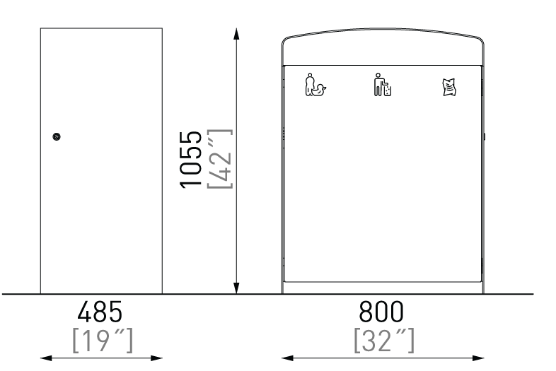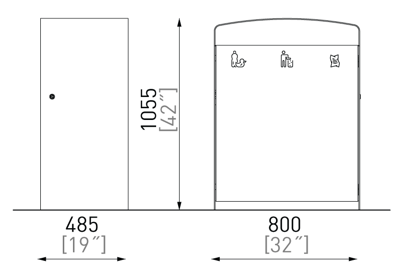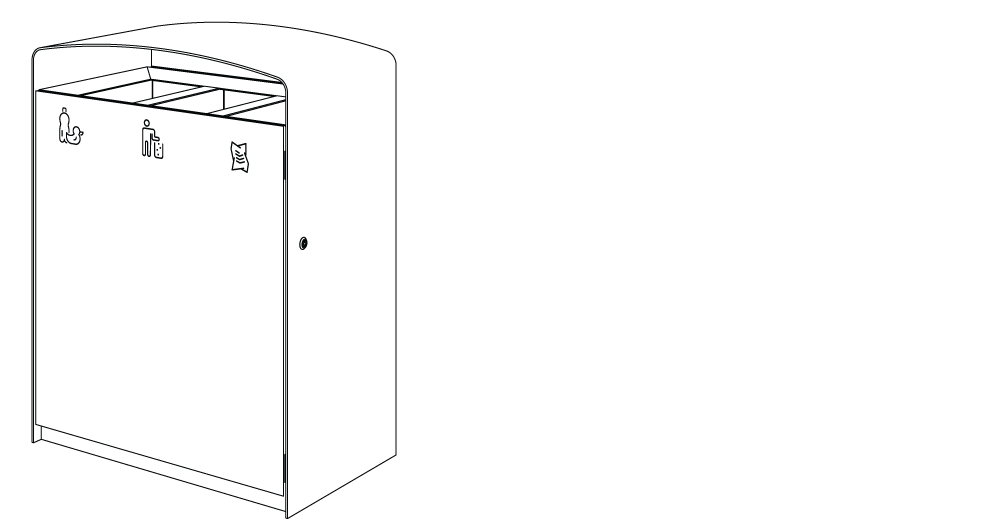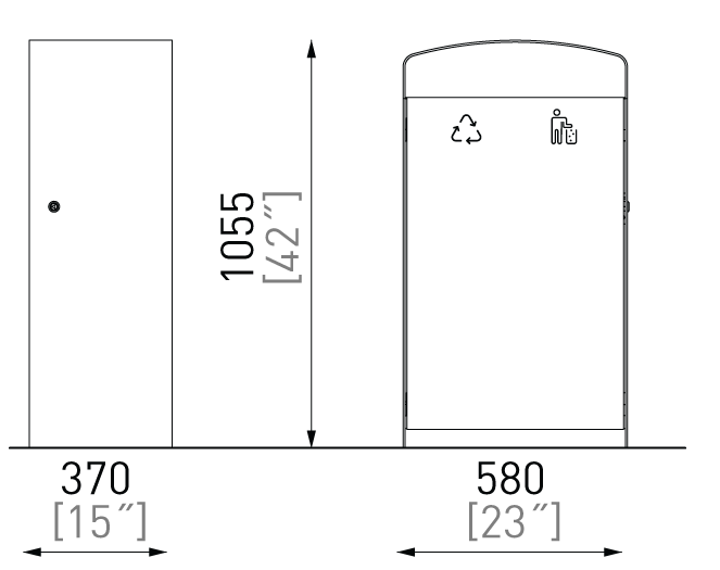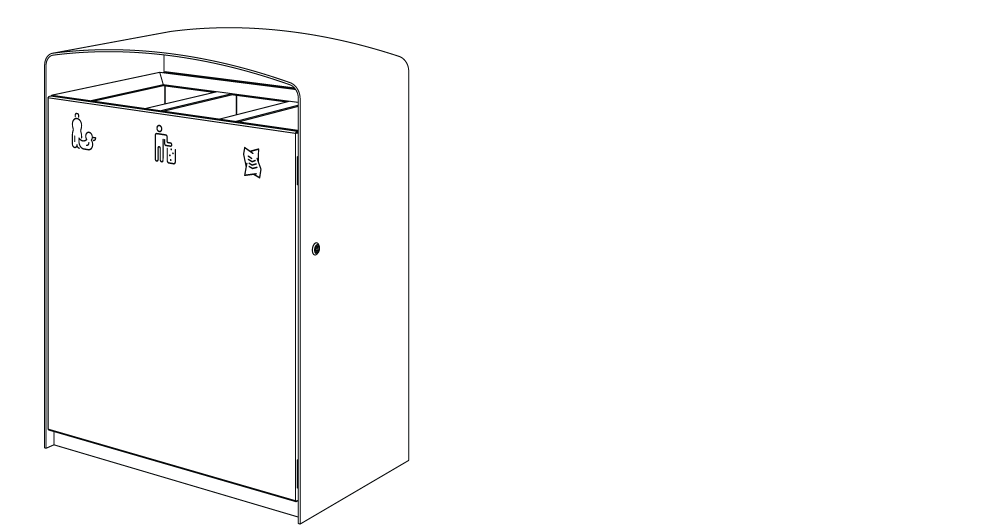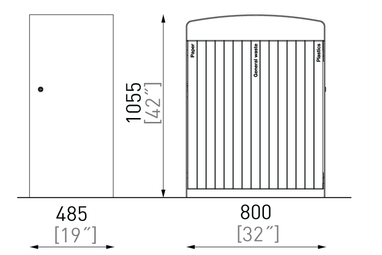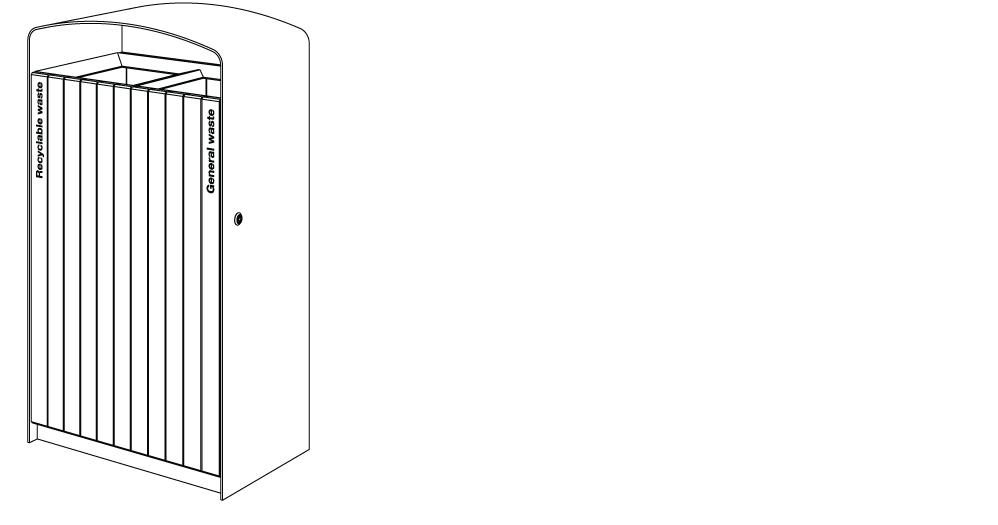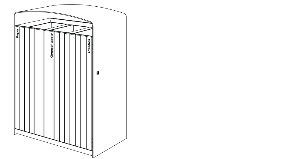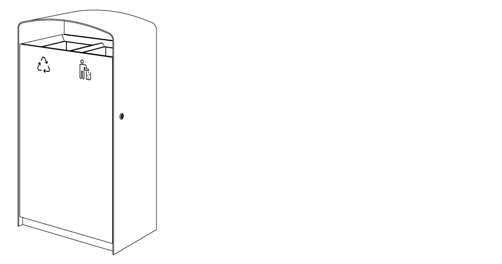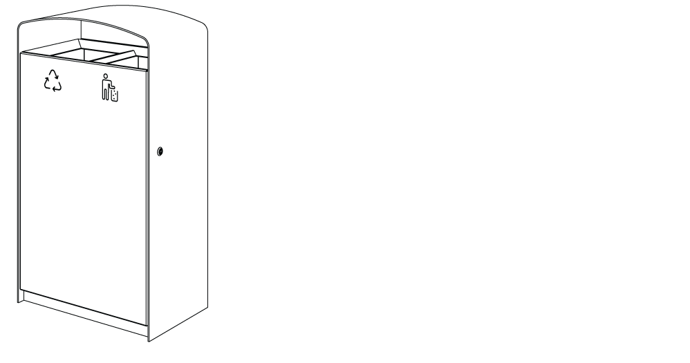Plášť z ocelového pozinkovaného plechu s nástřikem práškového vypalovacího laku, uzamykatelná dvířka z akátového nebo tropického dřeva či ocelového pozinkovaného plechu s nástřikem práškového vypalovacího laku nebo z vysokotlakého laminátu ve venkovním provedení. Vložená nádoba z pozinkovaného plechu nebo držák na plastový pytel (120 l).