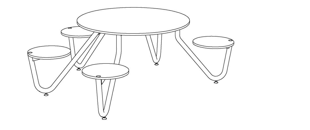 Structură din oțel zincat, suprapozabilă în timpul transportului, susține scaunele și blatul mesei sau tablă de aluminiu sau HPL. Picioarele reglabile din oțel inoxidabil nivelează masa pe o suprafață neuniformă și pot fi alternate cu șuruburi pentru ancorarea permanentă la suprafață.