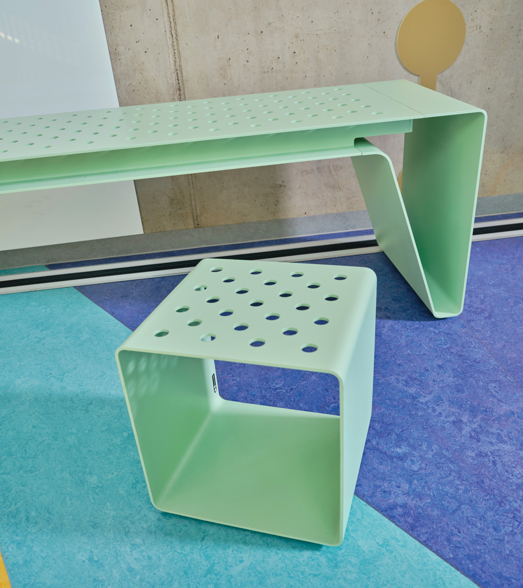 Конструкция из стального оцинкованного металлического листа, покрытая порошковым лаком. Сиденье из листового металла или ламелей из массива дерева, или из HPL-пластика. Быстрое крепление к поверхности. Привлекательной деталью станет двухцветная окраска конструкции, предлагаемая в шести цветовых комбинациях.